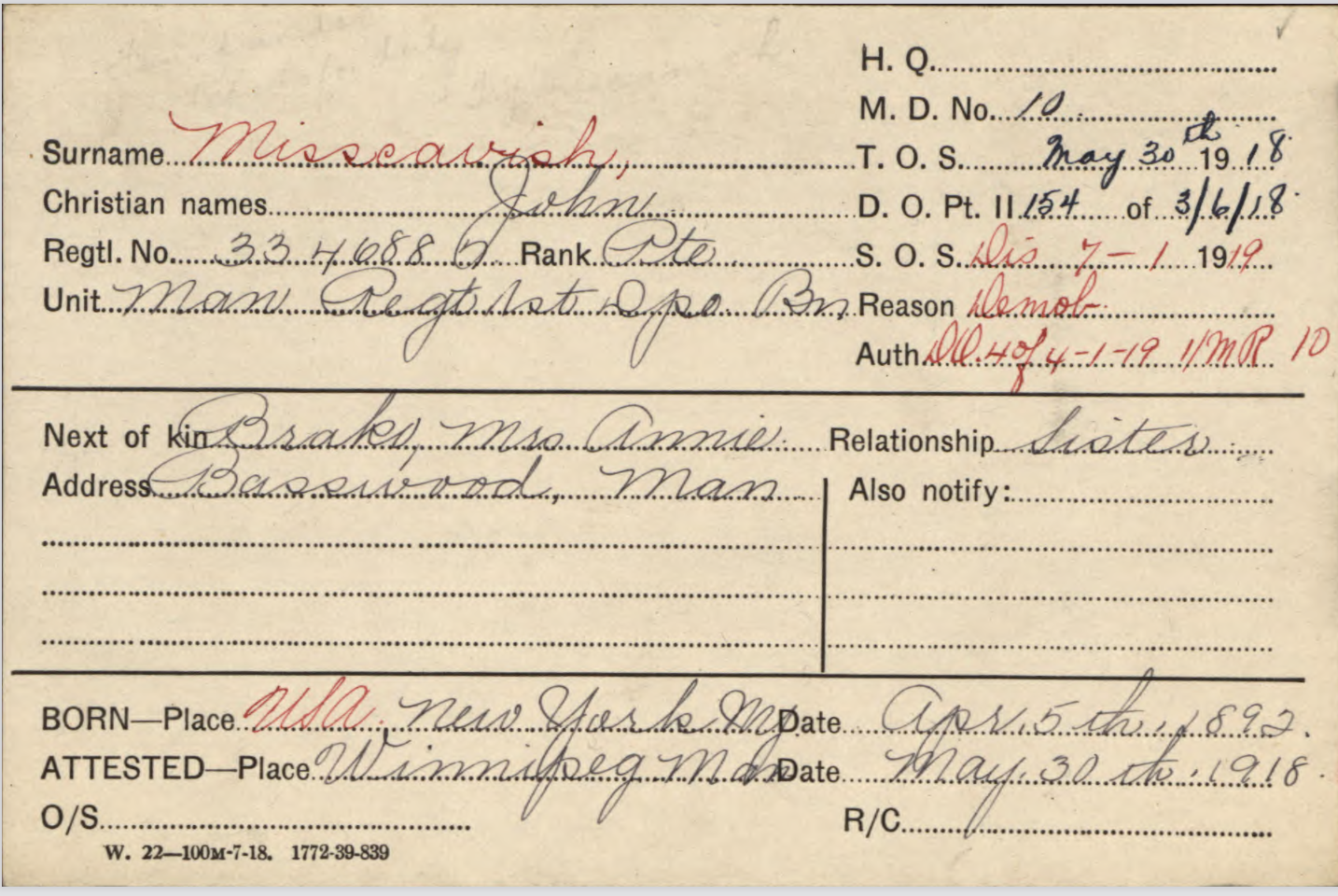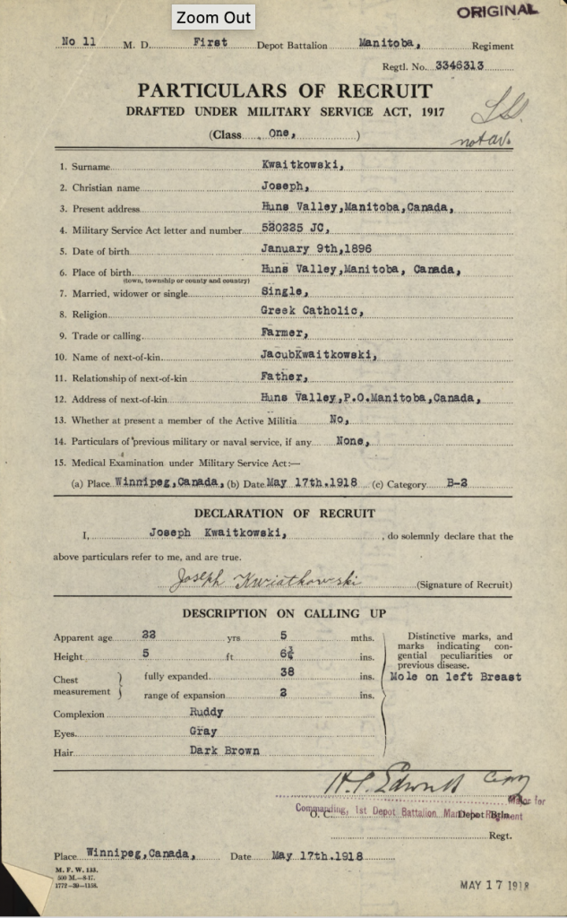 One such person was Joseph Kwiatkowski from Huns Valley / Polonia. He was recruited very late in the war and never actually saw service overseas. He was one of many that were excluded for mobilization due to one of these many requirements, but his file still remains for us to look at.