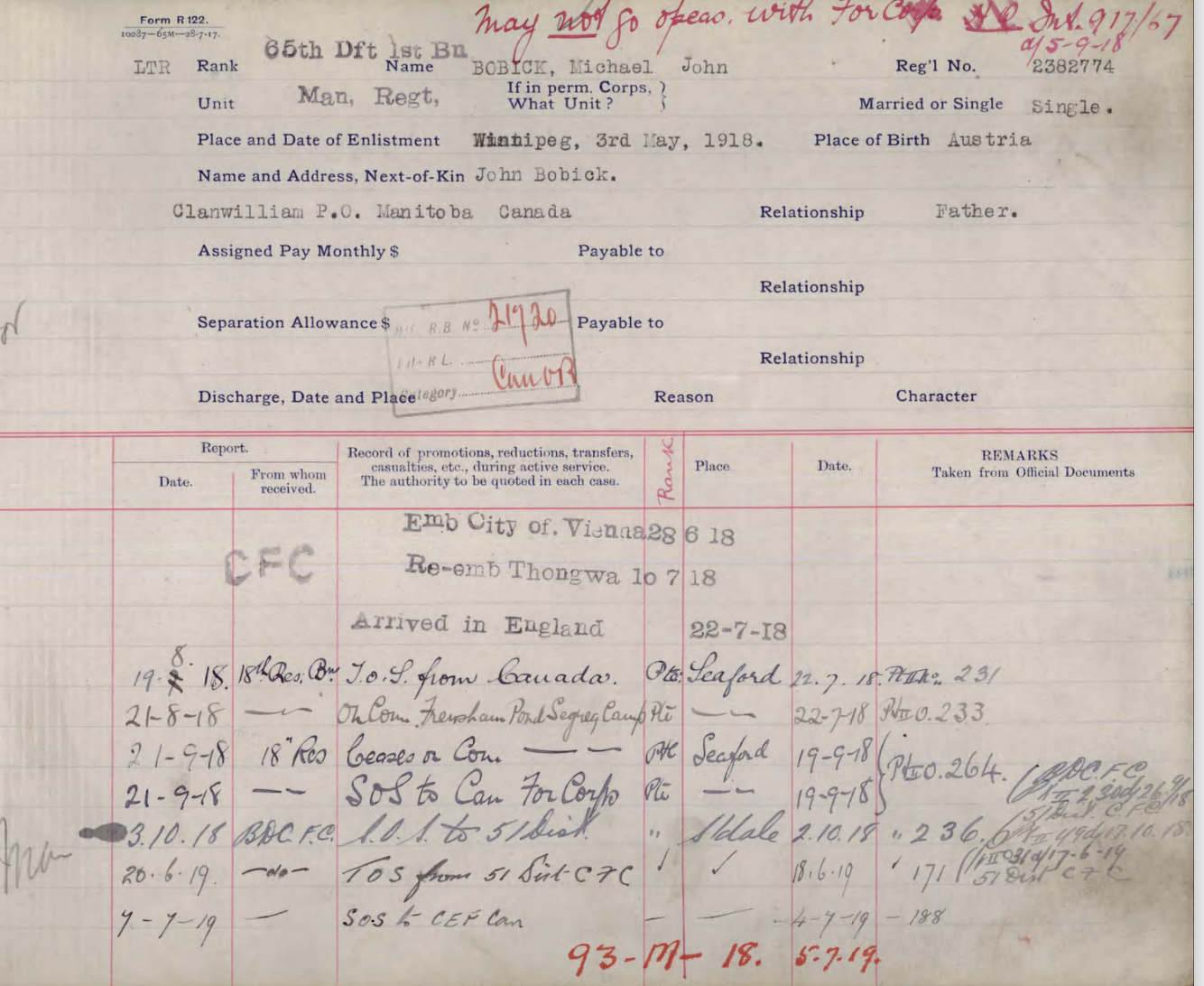 Library and Archives Canada has completed the huge task of digitizing the Canadian Expeditionary Force personnel files for the First World War. These records, which include soldiers, nurses and chaplains, consists of enlistment forms, training, medial history, and other information.