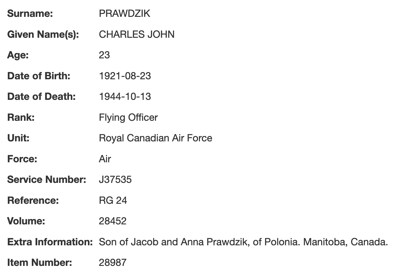 In 1944, Flying Officer Charles John Prawdzik was killed in action. There is no PDF file online, at Library and Archives Canada as yet and this is all the information they have.